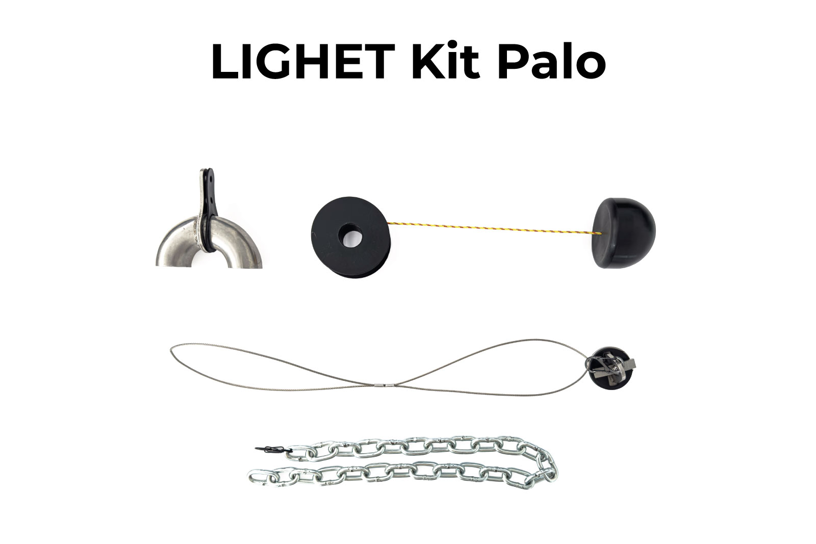 - LIGHET Kit Palo che comprende tutti i componenti che devono essere installati su ogni singolo palo: curva con viti, tappo, fune di richiamo, connettore a S, contrappeso a catena, contrappeso superiore, fune in acciaio a 8 (es. 100 pali à 100 Lighet kit palo);